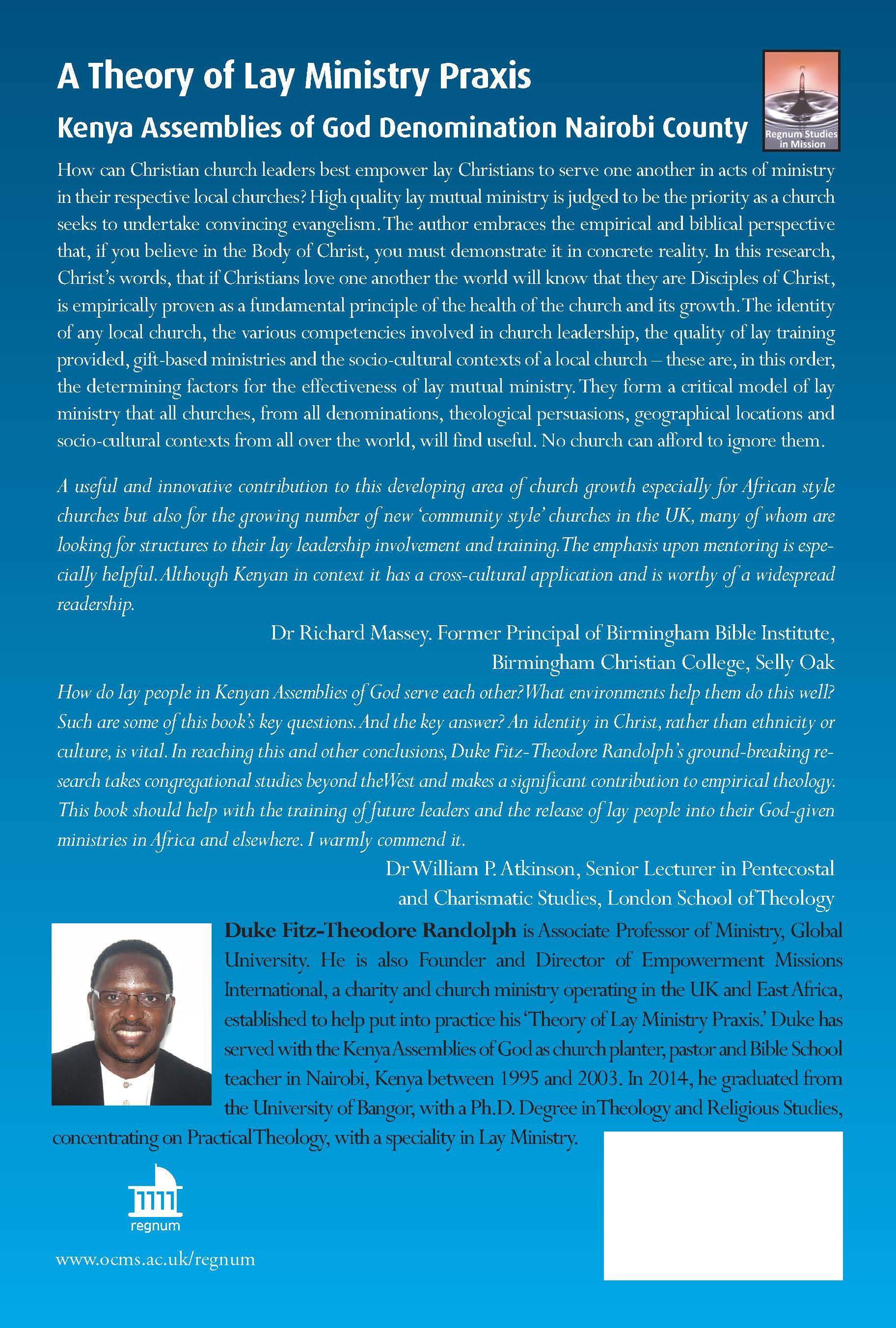 Duke Fitz-Theodore Randolph 2017 | 305pp | ISBN: 9781911372066 Kenya Assemblies of God Denomination Nairobi County How do lay people in Kenyan Assemblies of God serve each other? What environments help them do this well? Such are some of this book’s key questions. And the key answer? An identity in Christ, rather than ethnicity or culture, is vital. In reaching this and other conclusions, Duke Fitz-Theodore Randolph’s ground-breaking research takes congregational studies beyond the West and makes a significant contribution to empirical theology. This book should help with the training of future leaders and the release of lay people into their God-given ministries in Africa and elsewhere. I warmly recommend it. Dr William P Atkinson, Senior Lecturer in Pentecostal & Charismatic Studies, London School of Theology |