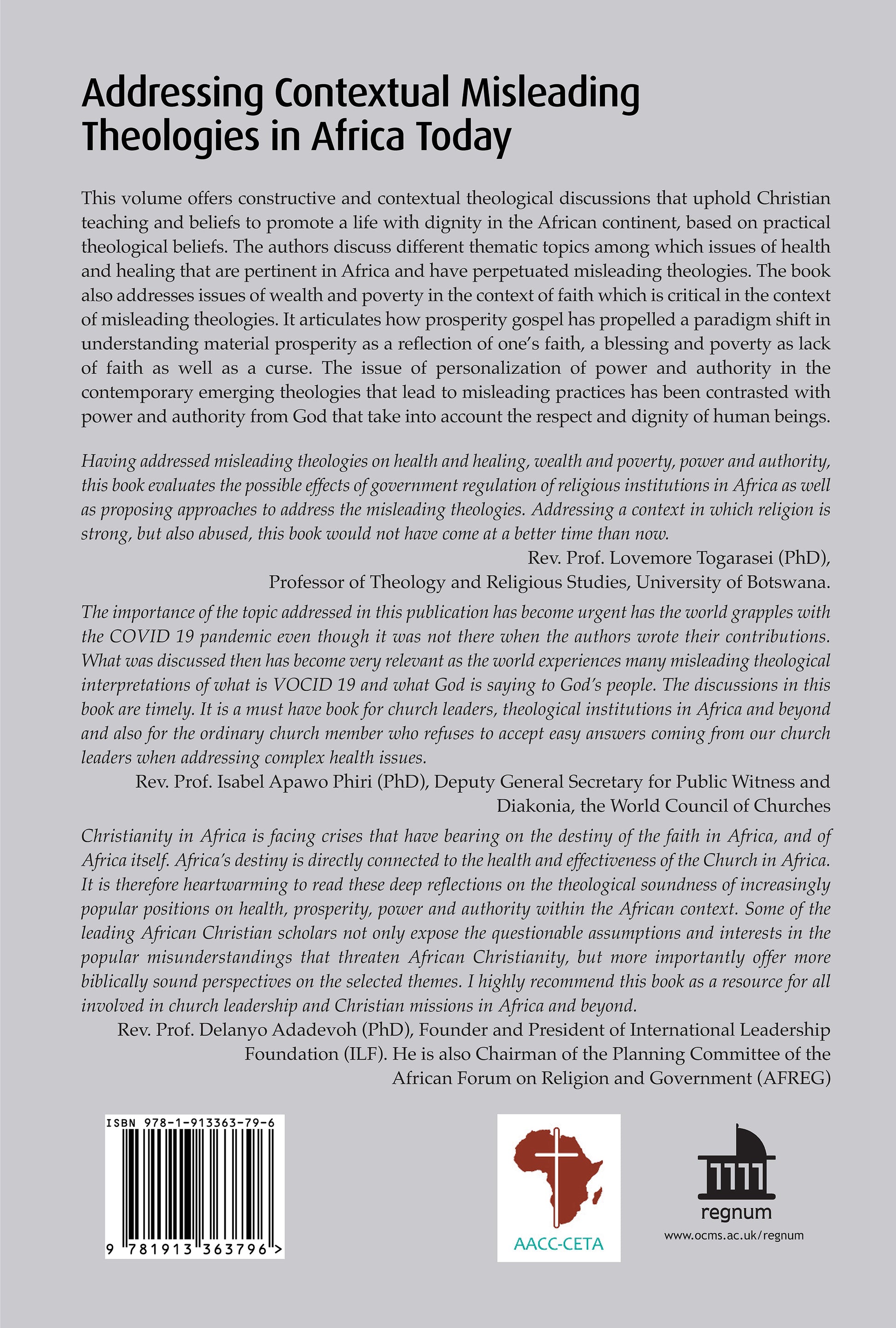 This volume offers constructive and contextual theological discussions that uphold Christian teaching and beliefs to promote a life with dignity in the African continent, based on practical theological beliefs. The authors discuss different thematic topics among which issues of health and healing that are pertinent in Africa and have perpetuated misleading theologies. The book also addresses issues of wealth and poverty in the context of faith which is critical in the context of misleading theologies. It articulates how prosperity gospel has propelled a paradigm shift in understanding material prosperity as a reflection of one’s faith, a blessing and poverty as lack of faith as well as a curse. The issue of personalization of power and authority in the contemporary emerging theologies that lead to misleading practices has been contrasted with power and authority from God that take into account the respect and dignity of human beings.