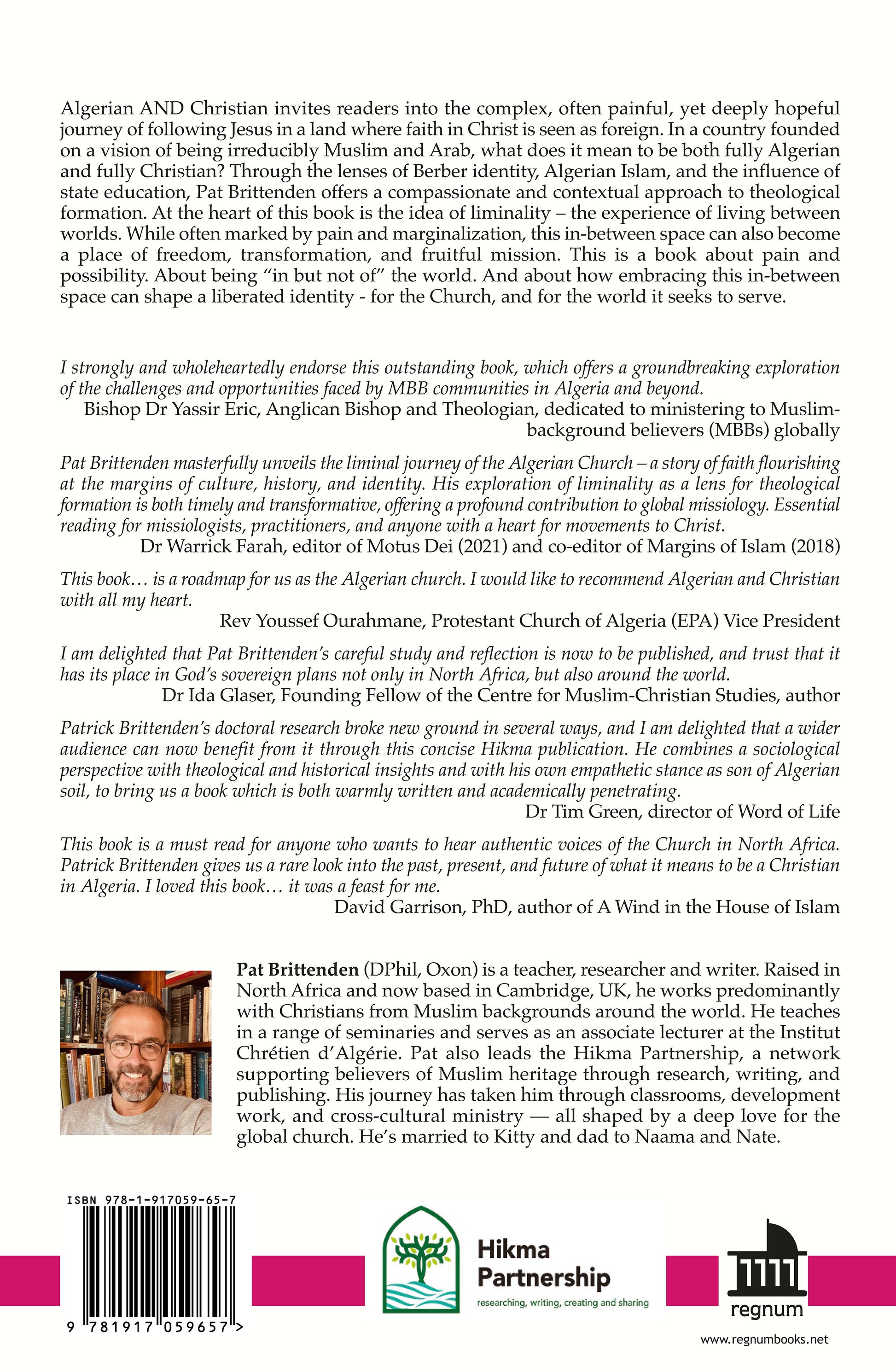 Algerian AND Christian invites readers into the complex, often painful, yet deeply hopeful journey of following Jesus in a land where faith in Christ is seen as foreign. In a country founded on a vision of being irreducibly Muslim and Arab, what does it mean to be both fully Algerian and fully Christian? Through the lenses of Berber identity, Algerian Islam, and the influence of state education, Pat Brittenden offers a compassionate and contextual approach to theological formation. At the heart of this book is the idea of liminality—the experience of living between worlds. While often marked by pain and marginalization, this in-between space can also become a place of freedom, transformation, and fruitful mission.This is a book about pain and possibility. About being “in but not of” the world. And about how embracing this in-between space can shape a liberated identity - for the Church, and for the world it seeks to serve.