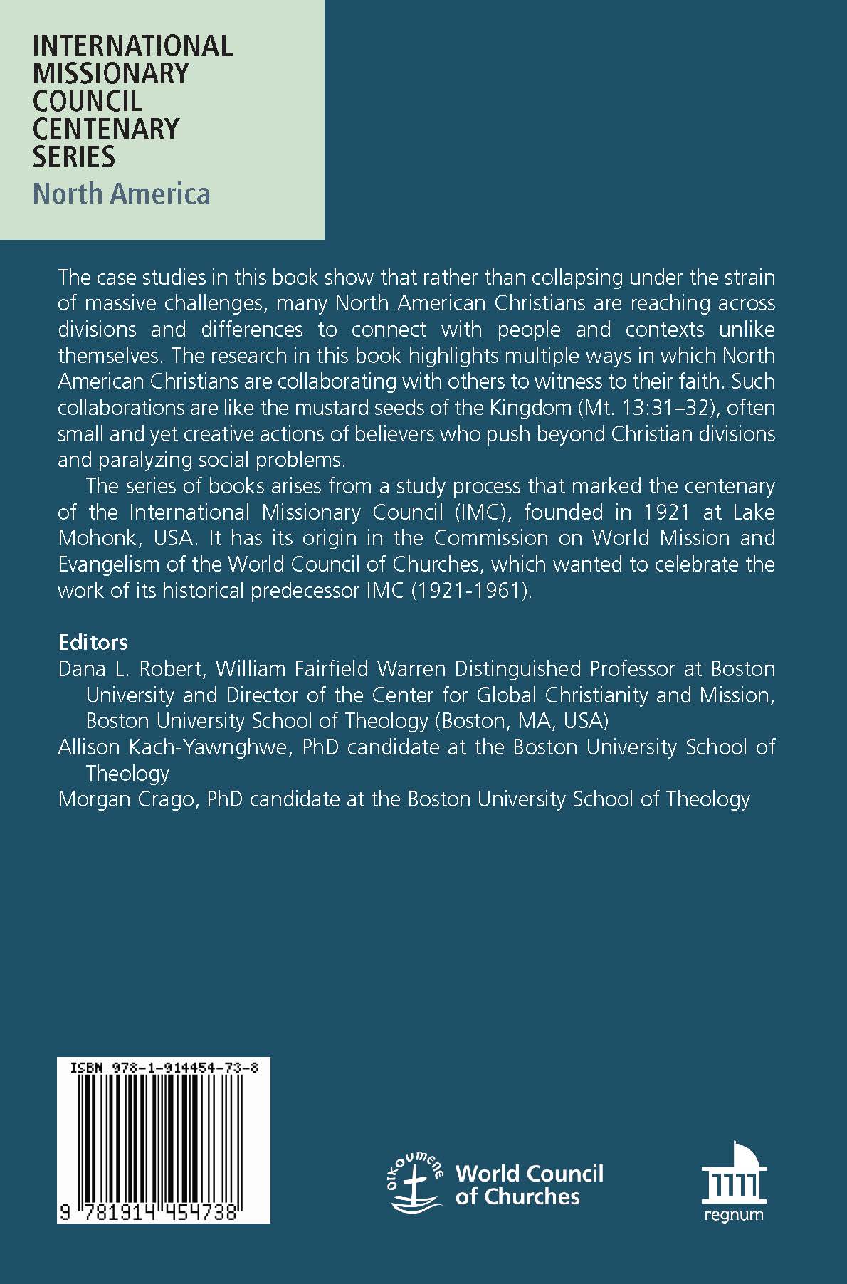 The case studies in this book show that rather than collapsing under the strain of massive challenges, many North American Christians are reaching across divisions and differences to connect with people and contexts unlike themselves. The research in this book highlights multiple ways in which North American Christians are collaborating with others to witness to their faith. Such collaborations are like the mustard seeds of the Kingdom (Mt. 13:31–32), often small and yet creative actions of believers who push beyond Christian divisions and paralyzing social problems.