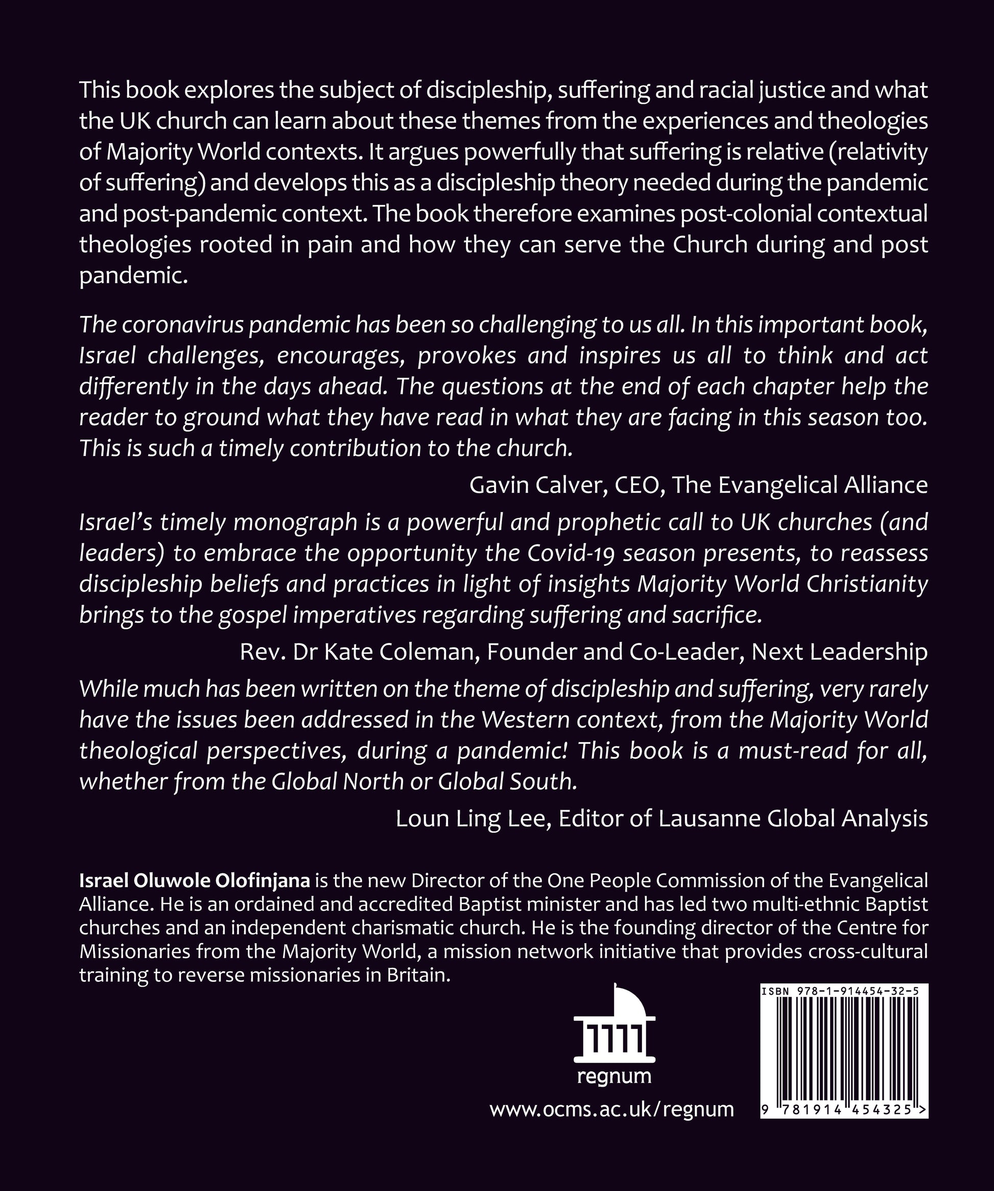 This book explores the subject of discipleship, suffering and racial justice and what the UK church can learn about these themes from the experiences and theologies of Majority World contexts. It argues powerfully that suffering is relative (relativity of suffering) and develops this as a discipleship theory needed during the pandemic and post-pandemic context. The book therefore examines post-colonial contextual theologies rooted in pain and how they can serve the Church during and post pandemic.