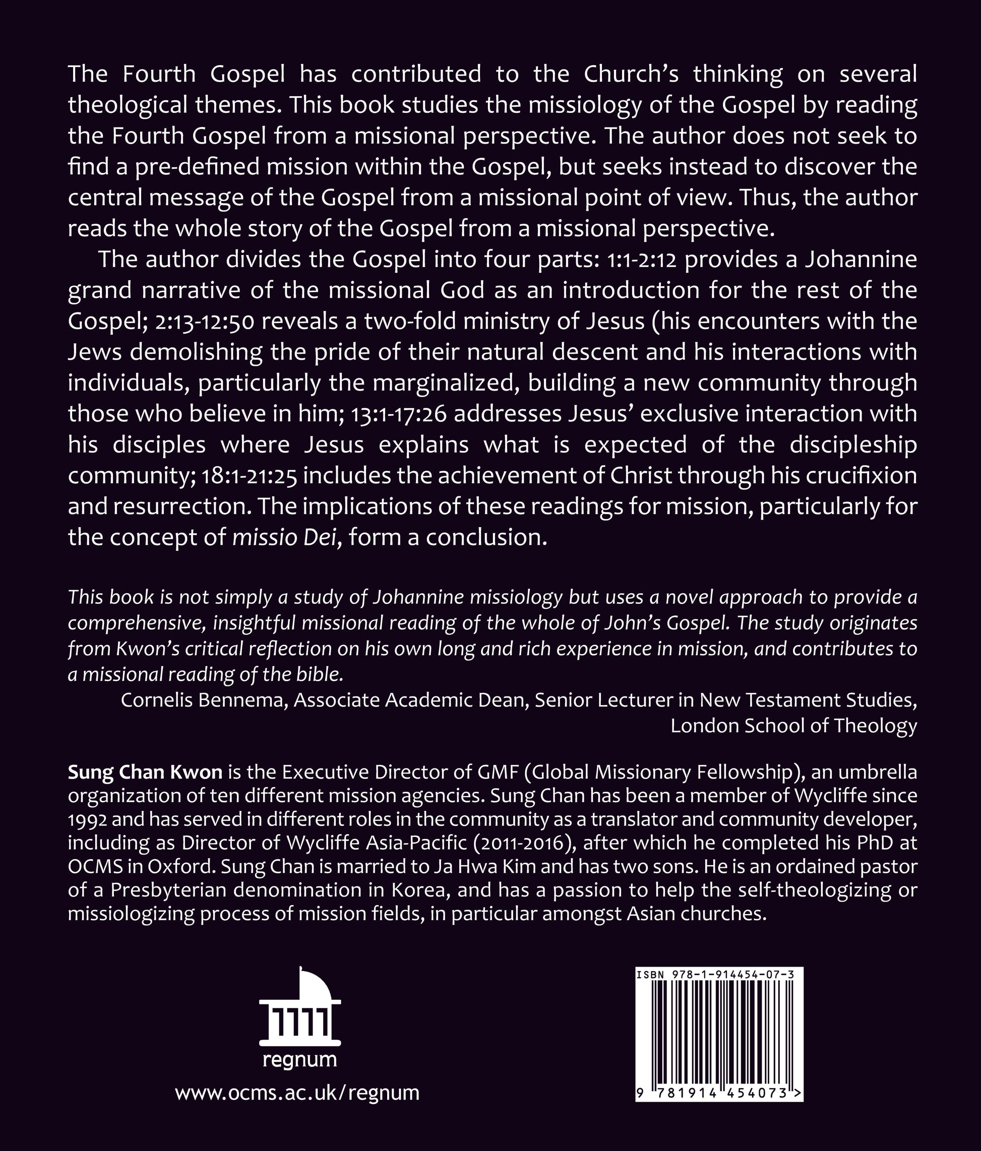 The Fourth Gospel has contributed to the Church’s thinking on several theological themes. This book studies the missiology of the Gospel by reading the Fourth Gospel from a missional perspective. The author does not seek to find a pre-defined mission within the Gospel, but seeks instead to discover the central message of the Gospel from a missional point of view. Thus, the author reads the whole story of the Gospel from a missional perspective. The author divides the Gospel into four parts: 1:1-2:12 provides a Johannine grand narrative of the missional God as an introduction for the rest of the Gospel; 2:13-12:50 reveals a two-fold ministry of Jesus (his encounters with the Jews demolishing the pride of their natural descent and his interactions with individuals, particularly the marginalized, building a new community through those who believe in him; 13:1-17:26 addresses Jesus’ exclusive interaction with his disciples where Jesus explains what is expected of the discipleship community; 18:1-21:25 includes the achievement of Christ through his crucifixion and resurrection. The implications of these readings for mission, particularly for the concept of missio Dei, form a conclusion.