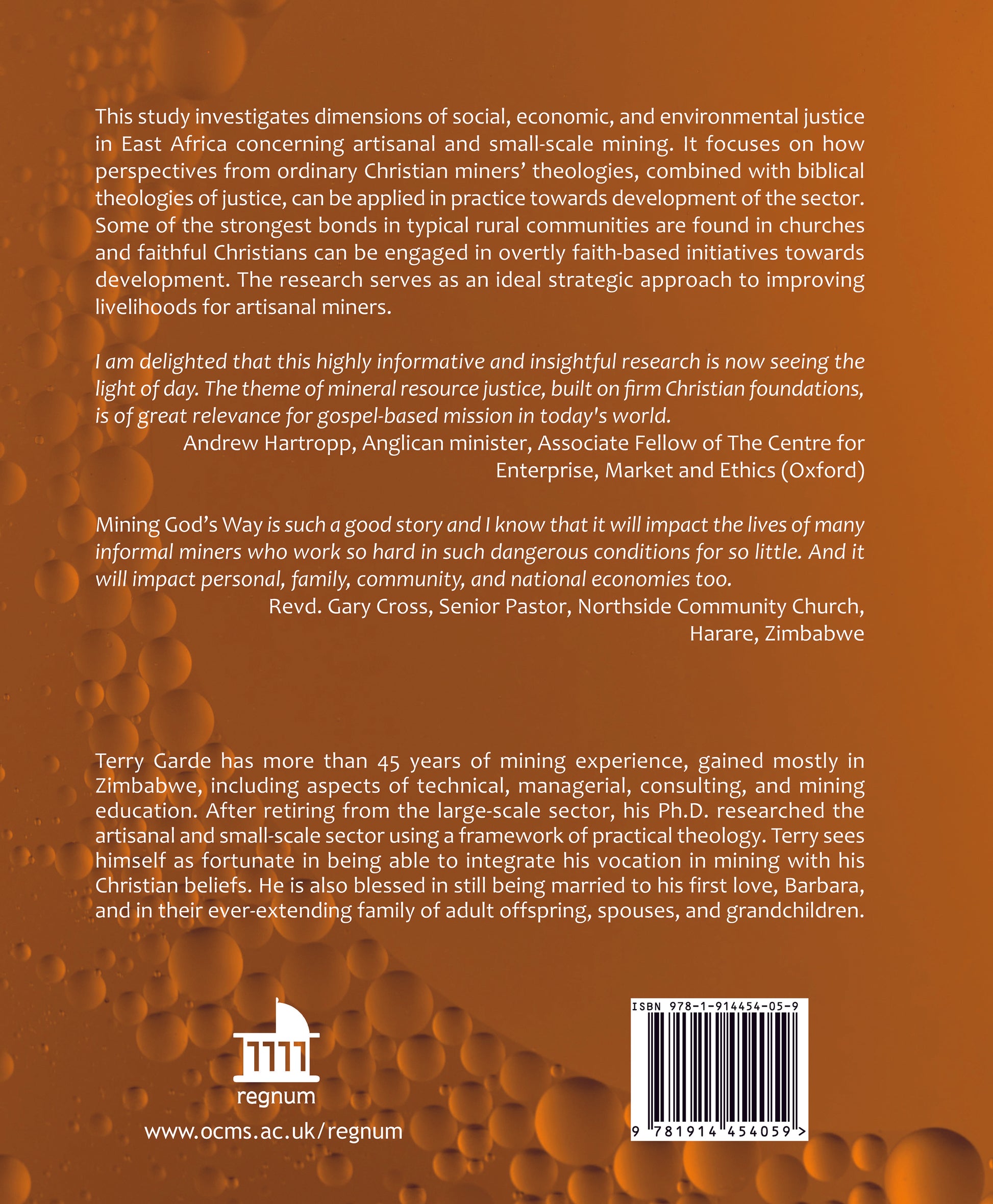 This study investigates dimensions of social, economic, and environmental justice in East Africa concerning artisanal and small-scale mining. It focuses on how perspectives from ordinary Christian miners’ theologies, combined with biblical theologies of justice, can be applied in practice towards development of the sector. Some of the strongest bonds in typical rural communities are found in churches and faithful Christians can be engaged in overtly faith-based initiatives towards development. The research serves as an ideal strategic approach to improving livelihoods for artisanal miners.