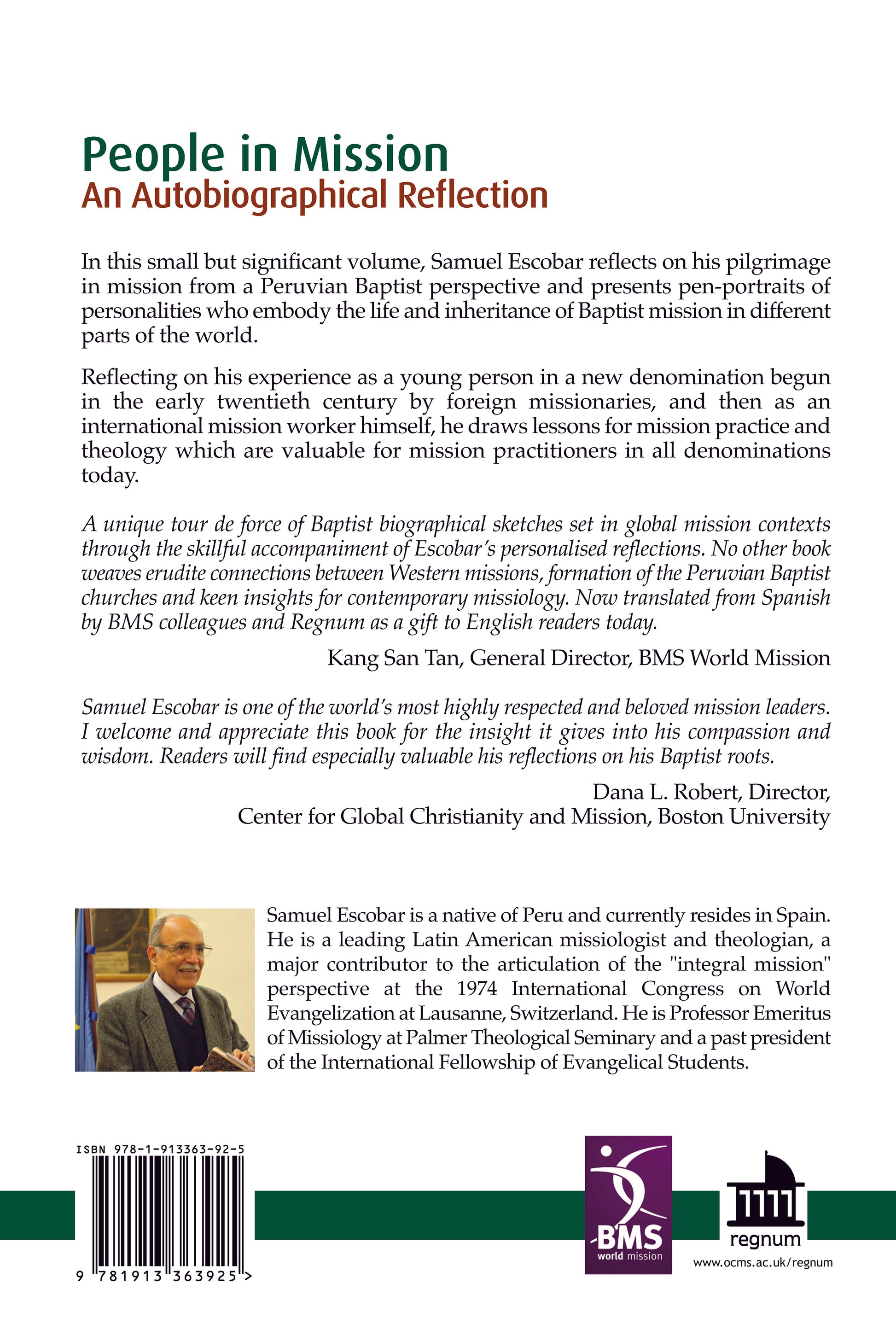 In this small but significant volume, Samuel Escobar reflects on his pilgrimage in mission from a Peruvian Baptist perspective and presents pen-portraits of personalities who embody the life and inheritance of Baptist mission in different parts of the world. Reflecting on his experience as a young person in a new denomination, begun in the early twentieth century by foreign missionaries, and then as an international mission worker himself, he draws lessons for mission practice and theology which are valuable for mission practitioners in all denominations today.