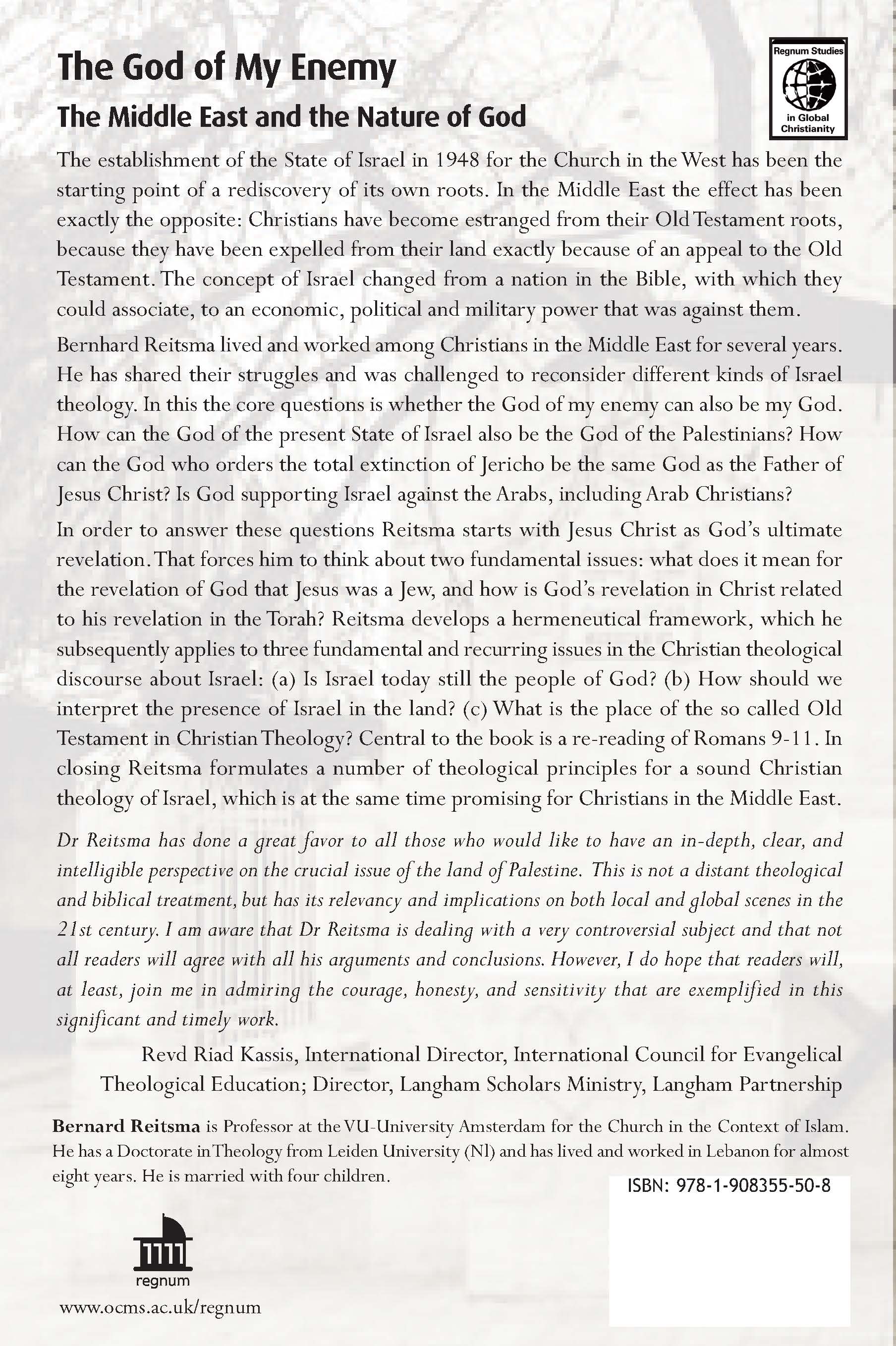 Dr Reitsma has done a great favor to all those who would like to have an in-depth, clear, and intelligible perspective on the crucial issue of the land of Palestine. This is not a distant theological and biblical treatment, but has its relevancy and implications on both local and global scenes in the 21st century. I am aware that Dr Reitsma is dealing with a very controversial subject and that not all readers will agree with all his arguments and conclusions. However, I do hope that readers will, at least, join me in admiring the courage, honesty, and sensitivity that are exemplified in this significant and timely work.