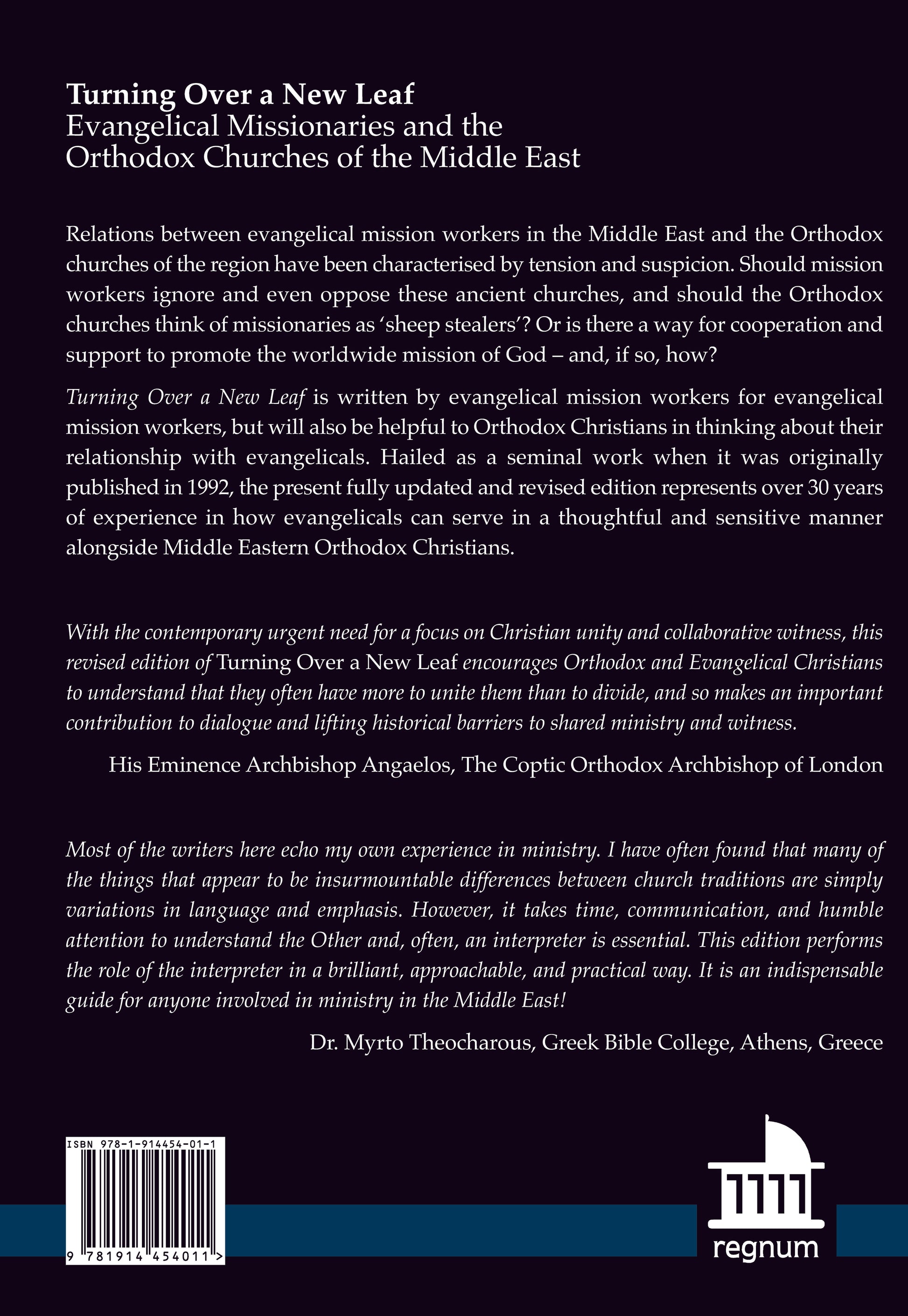 Relations between evangelical mission workers in the Middle East and the Orthodox churches of the region have been characterised by tension and suspicion. Should mission workers ignore and even oppose these ancient churches, and should the Orthodox churches think of missionaries as ‘sheep stealers’? Or is there a way for cooperation and support to promote the worldwide mission of God – and, if so, how? Turning Over a New Leaf is written by evangelical mission workers for evangelical mission workers, but will also be helpful to Orthodox Christians in thinking about their relationship with evangelicals. Hailed as a seminal work when it was originally published in 1992, the present fully updated and revised edition represents over 30 years of experience in how evangelicals can serve in a thoughtful and sensitive manner alongside Middle Eastern Orthodox Christians.